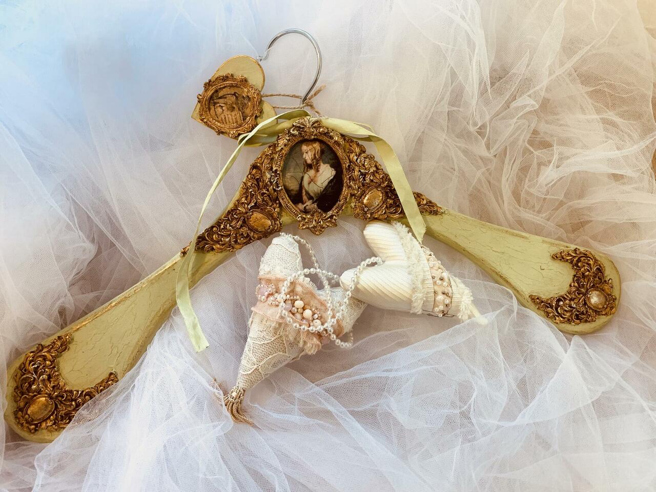 Kuldse raamiga ja vana portree pildiga riidepuu.