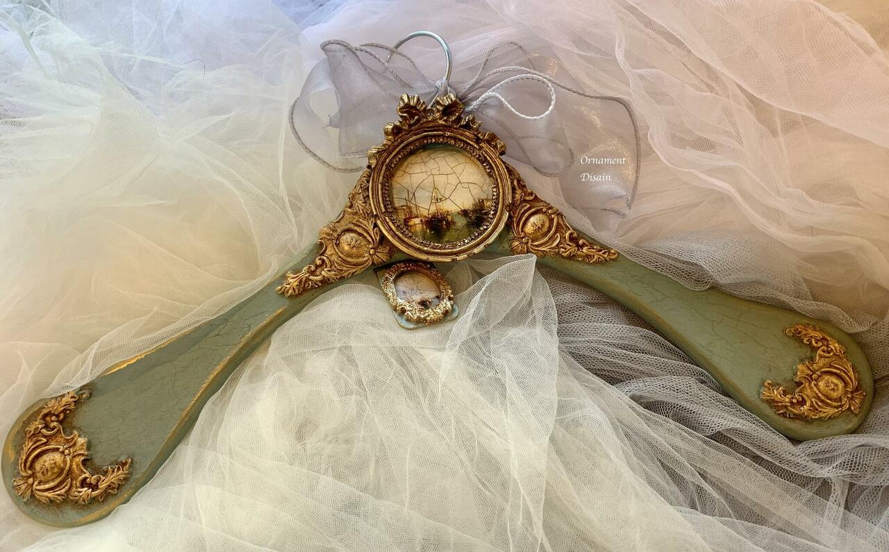 Suure kuldse raamiga ja vana maali pildiga riidepuu.