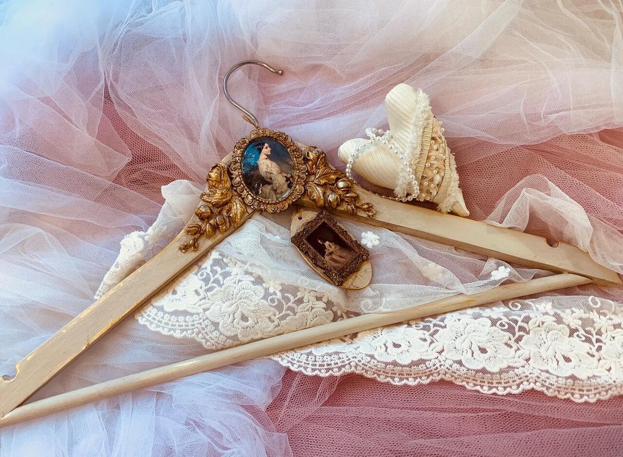 Kuldse raamiga ja vana portree pildiga kreemikas valge riidepuu.