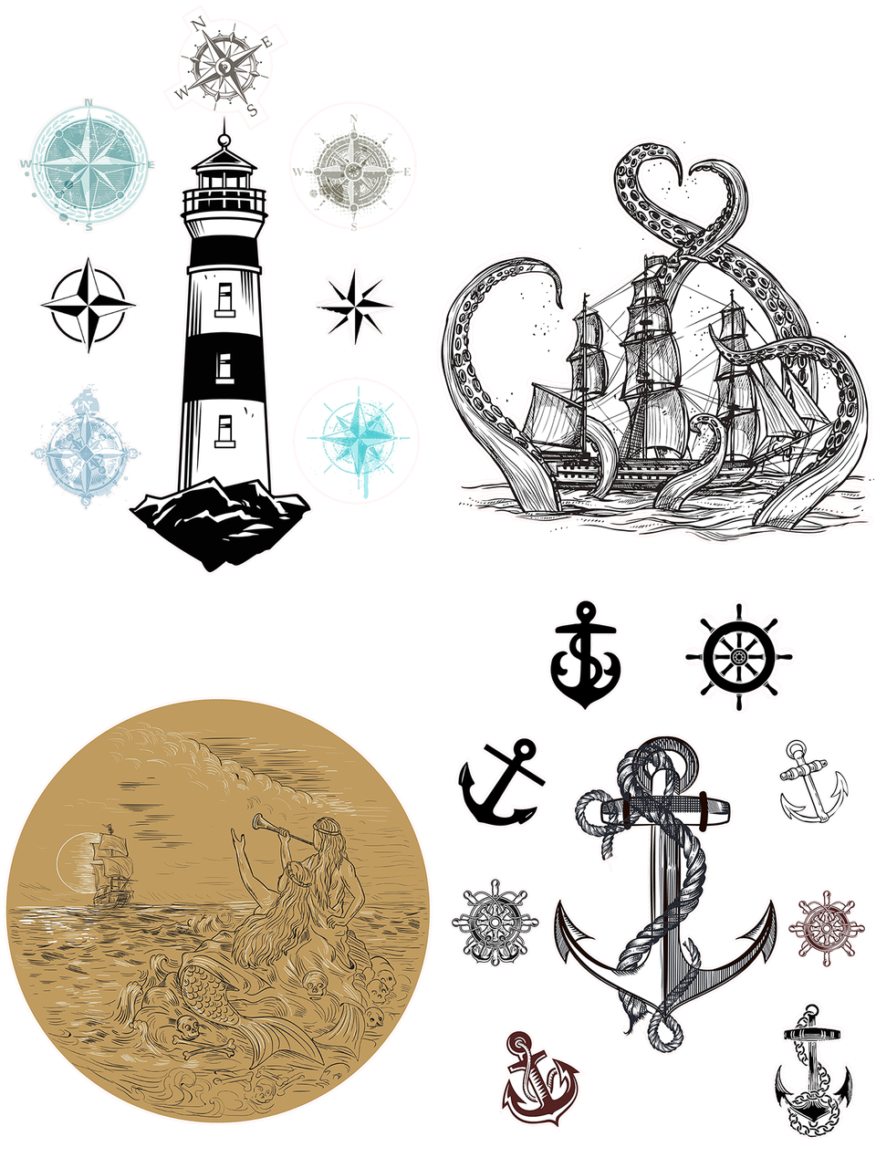 Mere teemaline siirdepilt. Alates laevahukkudest kuni sireenideni annab see komplekt teie projektidele mereelu.