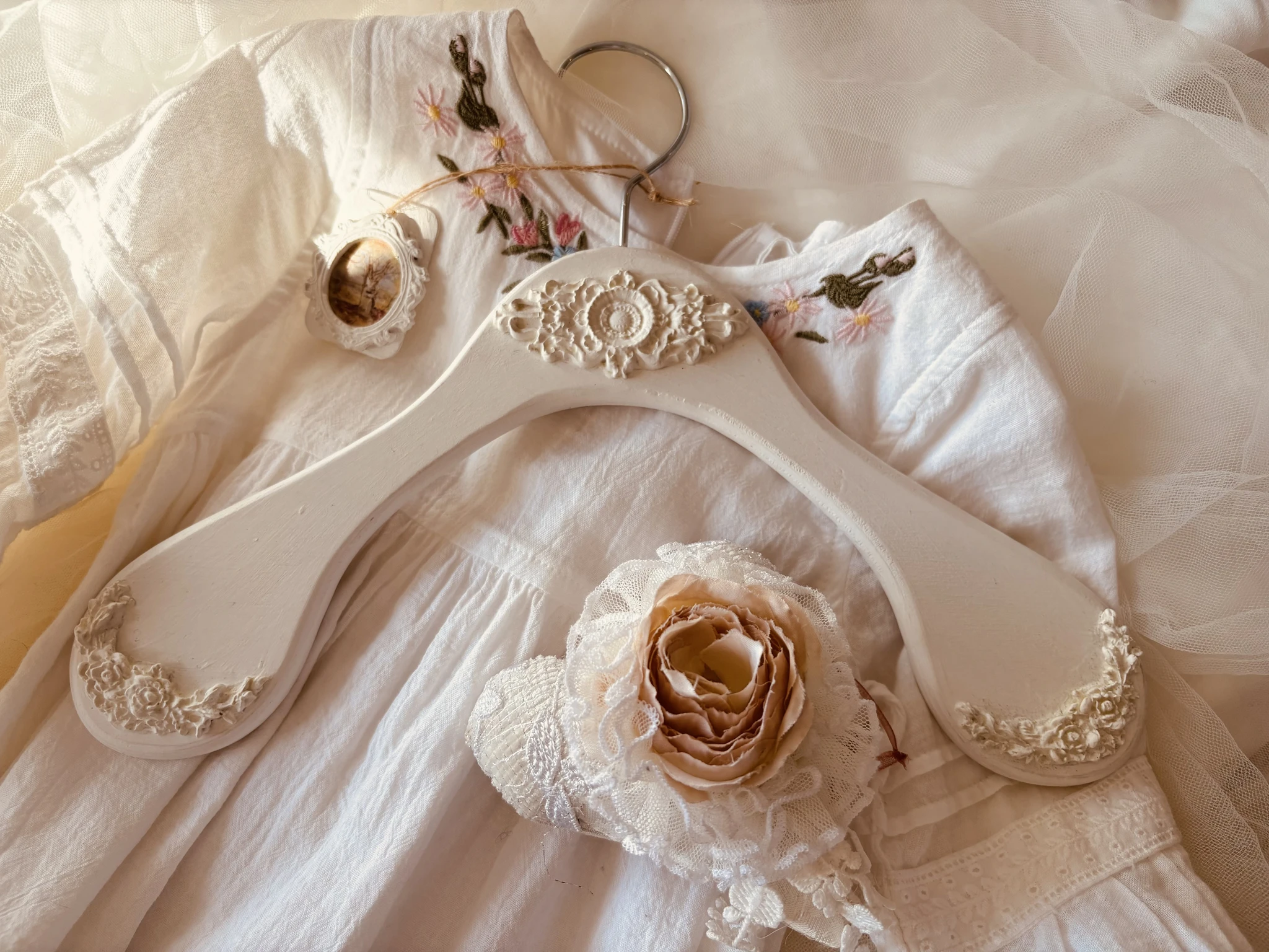 Laste valge ornamendiga käsitöö riidepuu