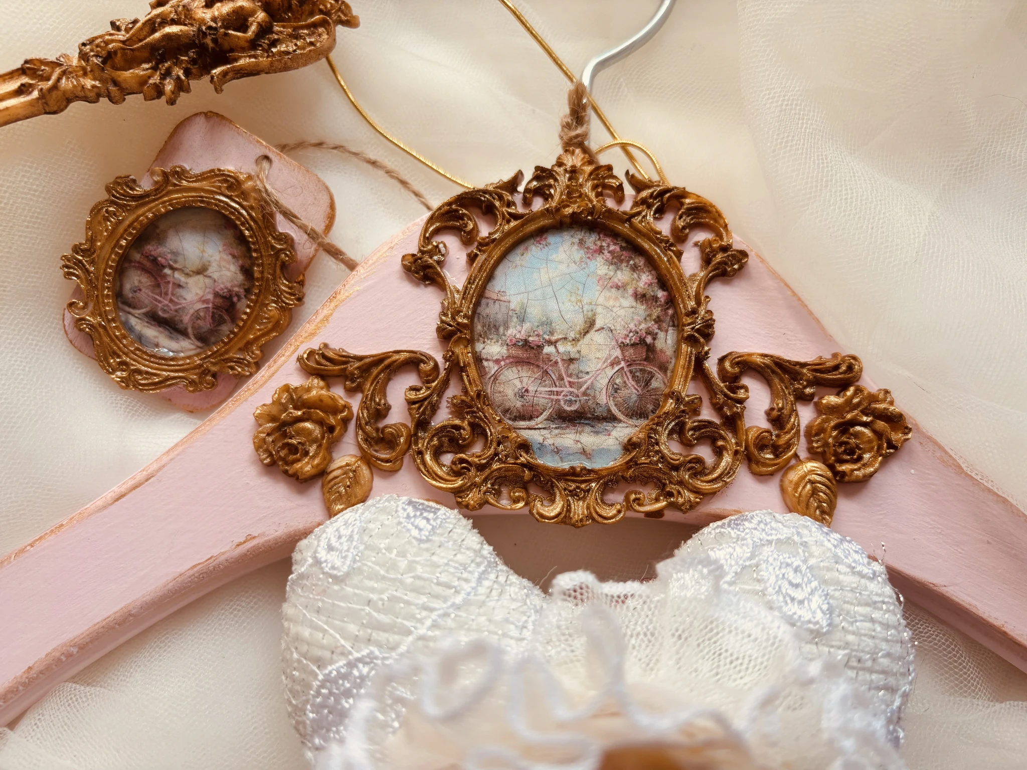 Kuldses raamis pildiga käsitöö riidepuu.