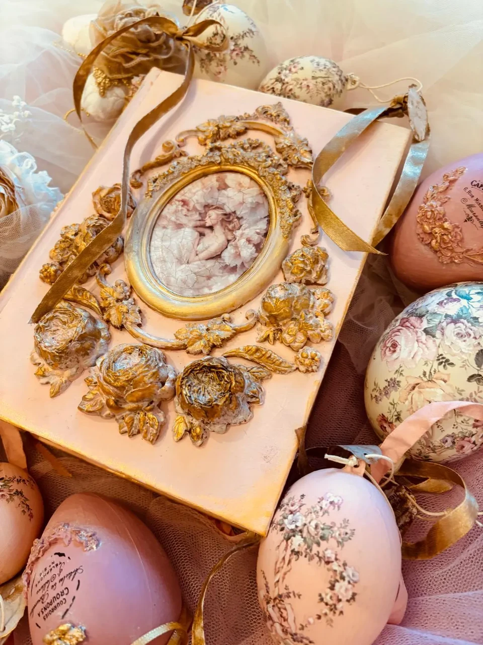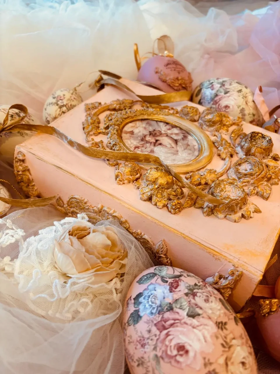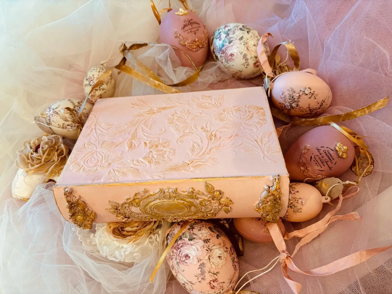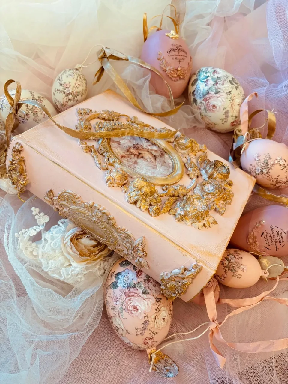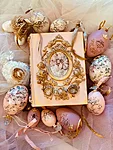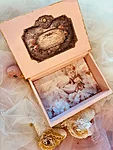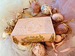 Puidust kaanega karp, mõõtudega: 18,5 x 23 x 6 cm. Kasutatud kriidivärvi ja kahekomponentset vaiku, vaha, pildi peal lakk, paber.