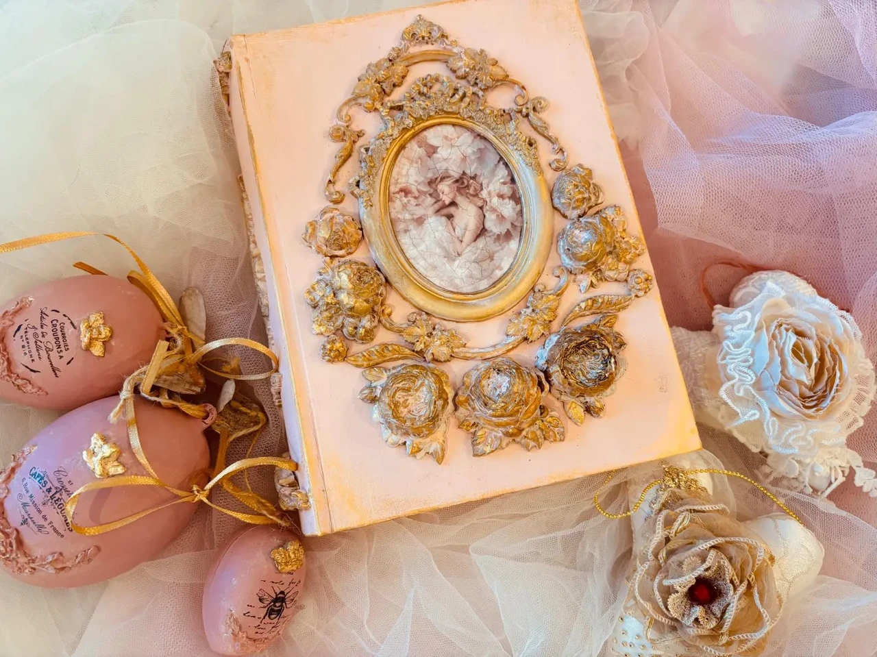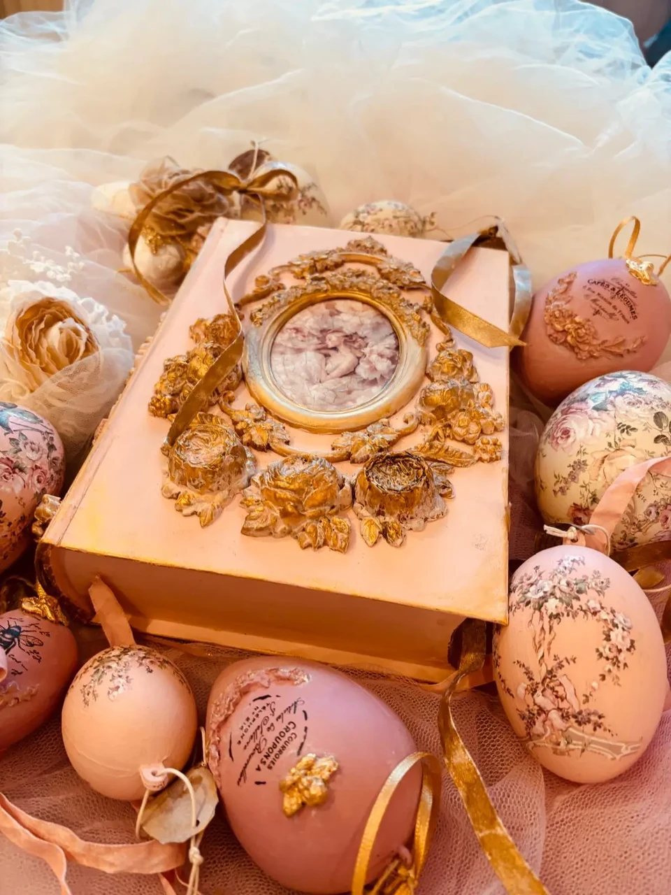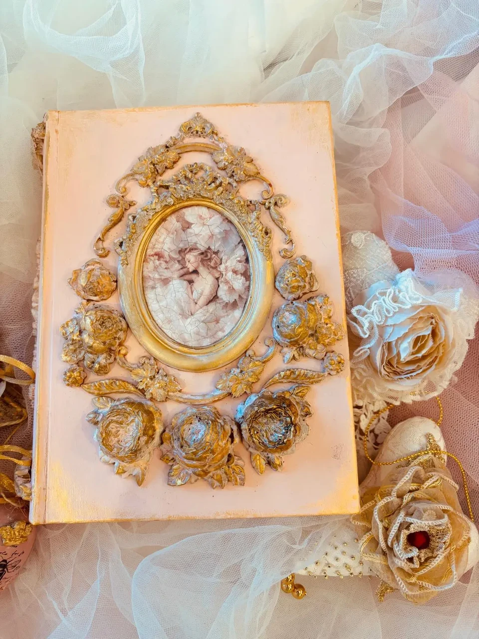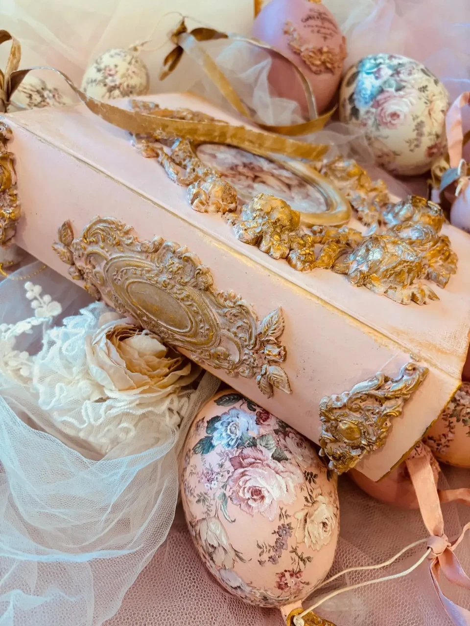 Puidust kaanega karp, mõõtudega: 18,5 x 23 x 6 cm. Kasutatud kriidivärvi ja kahekomponentset vaiku, vaha, pildi peal lakk, paber.